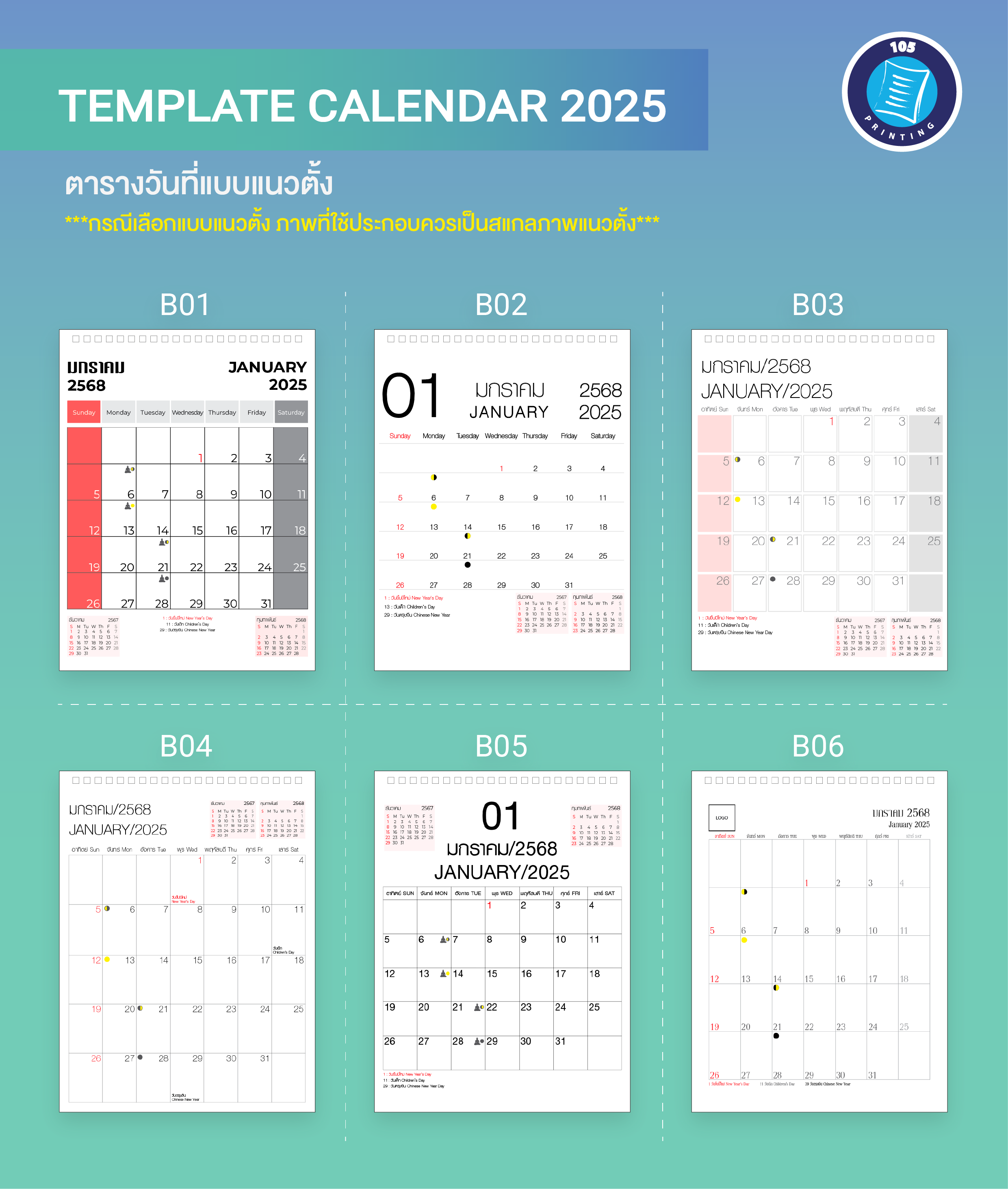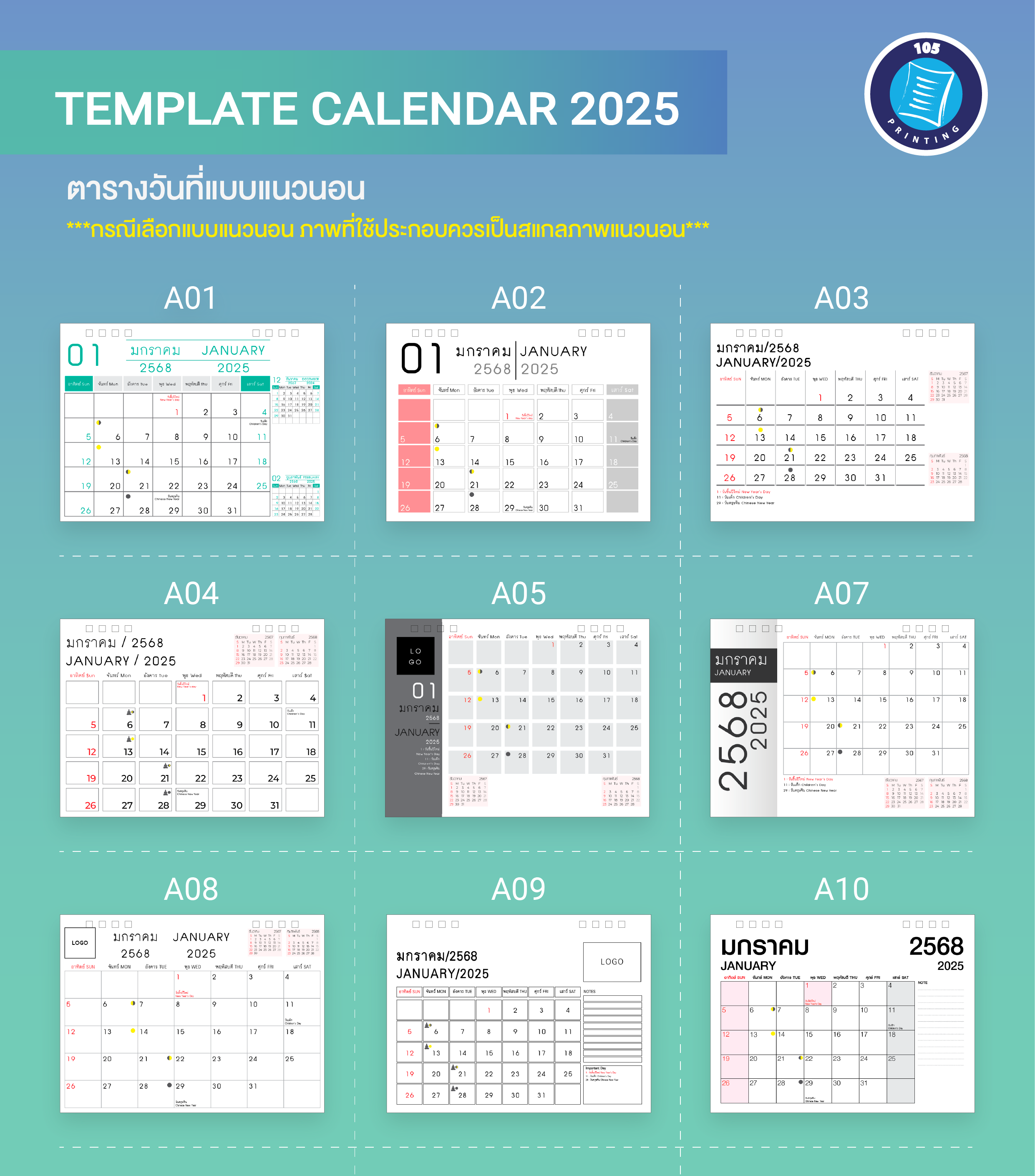 1. ฟรี Template ปฏิทินตั้งโต๊ะ สำหรับลูกค้าที่ใช้โปรแกรม Adobe Illustrator (AI) ได้ และต้องการออกแบบปฏิทินด้วยตนเอง สามารถเลือกแบบเทมเพลทรายเดือน 1 แบบตามตัวอย่างด้านล่าง เพื่อไปใช้ในการออกแบบ หลังการสั่งซื้อและชำระมัดจำค่ะ หรือเลือกใช้ บริการออกแบบปฏิทินตั้งโต๊ะ โดยทีมงานออกแบบผู้เชี่ยวชาญของเรา สำหรับ 12 เดือน เพียงชุดละ 5,000 บาท เท่านั้น (ภาพประกอบและข้อความจัดหาโดยลูกค้า) (ราคาออกแบบนี้สงวนสิทธิ์เมื่อจัดพิมพ์กับทางโรงพิมพ์เท่านั้น)
